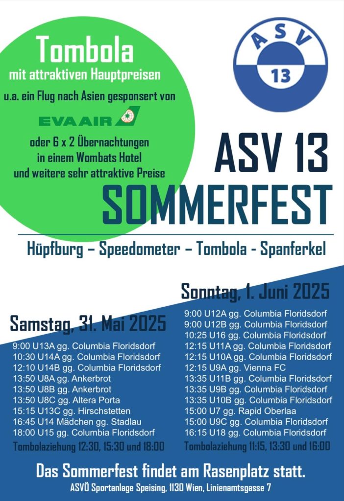 Am Wochenende des 31. Mai und 1. Juni 2025 verwandelt sich die ASVÖ Sportanlage Speising in der Linienamtsgasse 7 in ein buntes Festgelände. Der ASV 13 lädt zum großen Sommerfest mit Fußball, Unterhaltung und einer attraktiven Tombola.