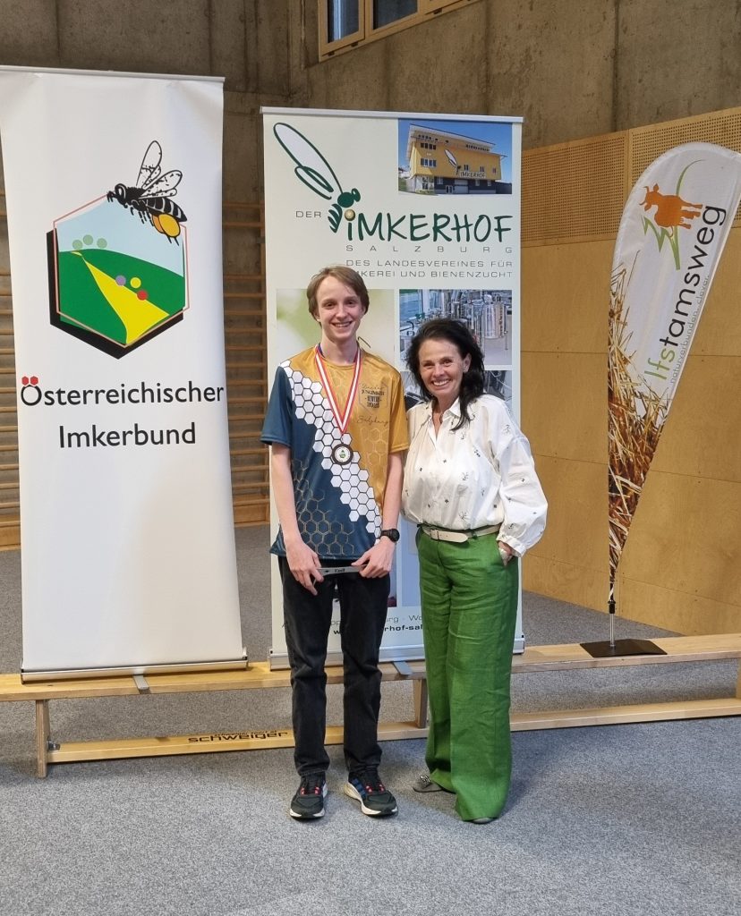 An seiner Seite: Sabine Rauch, Jugendreferentin des Landesverbandes für Bienenzucht in Wien. Sie bereitete Emil intensiv auf den Bewerb vor und begleitete ihn durch die Wettbewerbstage in Salzburg. Ihre Unterstützung zahlte sich aus – denn Emil konnte mit seinem ersten Auftritt auf Bundesebene gleich ein starkes Zeichen setzen. Das gute Zusammenspiel zwischen Wissen, Vorbereitung und Begeisterung war bei jedem Schritt spürbar und machte ihn zum Vorbild für viele junge Imkerinnen und Imker in ganz Österreich.