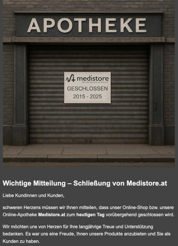 Seit Jahren tobte hinter den Kulissen der Konflikt. Standesvertretung und Behörden beäugten die Online-Apotheke kritisch. Zuletzt glaubte man eigentlich, dass sich die Lage beruhigt hätte und der Online-Bereich überleben könnte. Weit gefehlt, wie medistore.at nun betont: “Grund für die Schließung ist maßgeblich ein zunehmend verzerrter Wettbewerb, der heimische Anbieter stark unter Druck setzt.”
