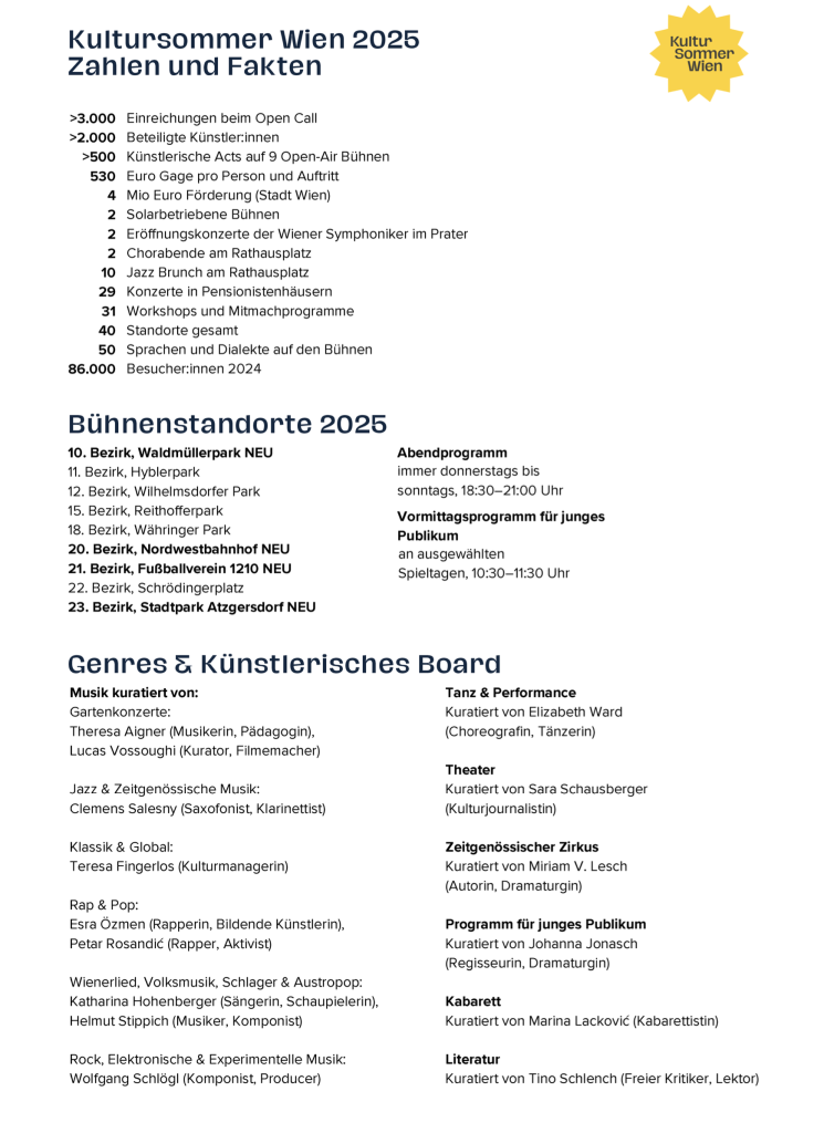 Unter dem Motto „Kultur ist, wo du bist“ kehrt der Kultursommer Wien auch 2025 wieder zurück in die Parks und Grätzl der Stadt. Sieben Wochen lang verwandelt sich Wien in eine große Freiluftbühne, auf der rund 2000 Künstler:innen aus Musik, Theater, Tanz, Literatur, Kabarett und zeitgenössischem Zirkus ein vielfältiges Programm bieten – bei freiem Eintritt.