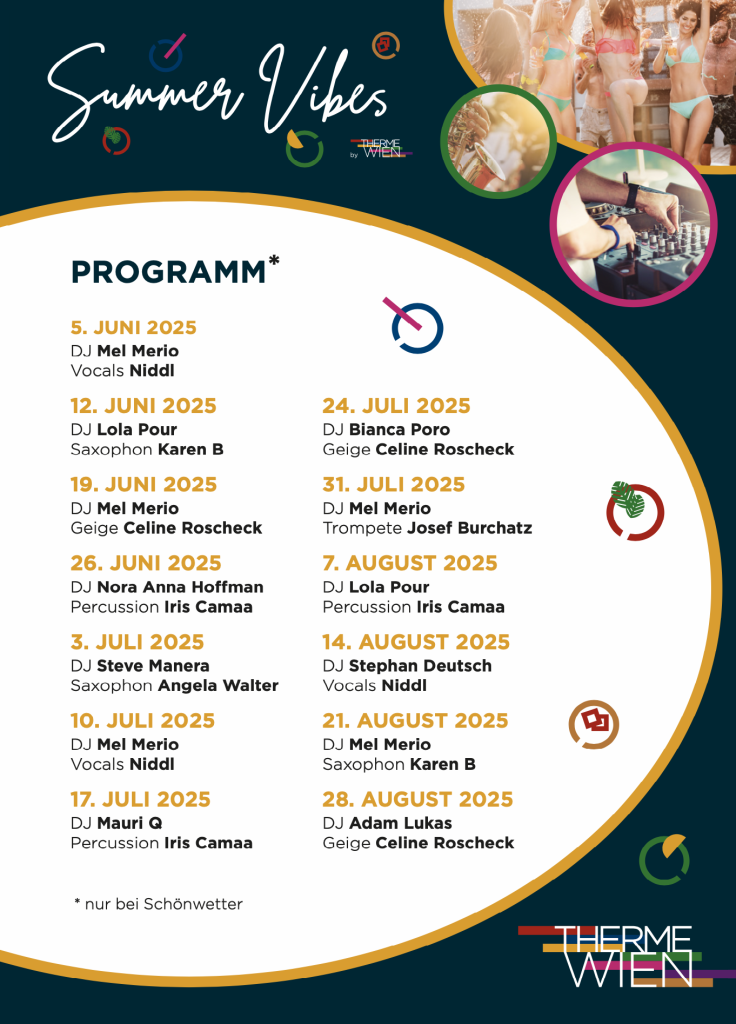 In diesem Sommer dürfen sich Gäste auf ein abwechslungsreiches Musikprogramm freuen. Neben Mel Merio sorgen unter anderem Niddl, Celine Roschek mit ihrer Elektro-Violine und DJ Mauri für sommerliche Stimmung. Das detaillierte Programm ist online unter www.thermewien.at/summer-vibes abrufbar.