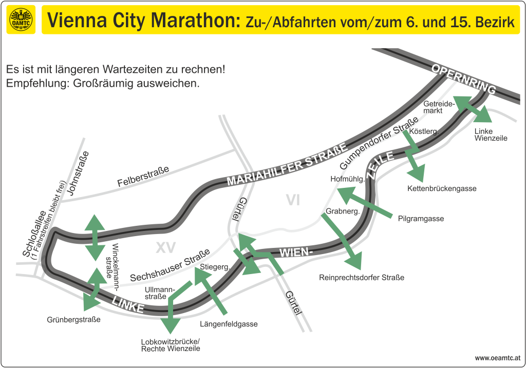 Von 08:30 bis 13:00 Uhr sind der 6. Bezirk und Teile des 15. Bezirks nur schwer erreichbar. Die Laufstrecke führt über die Linke Wienzeile und zurück über die Mariahilfer Straße.